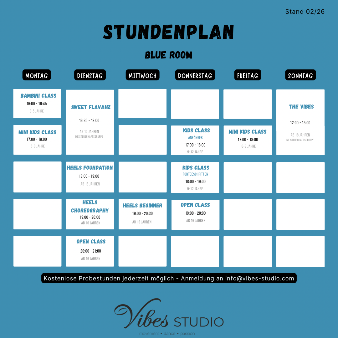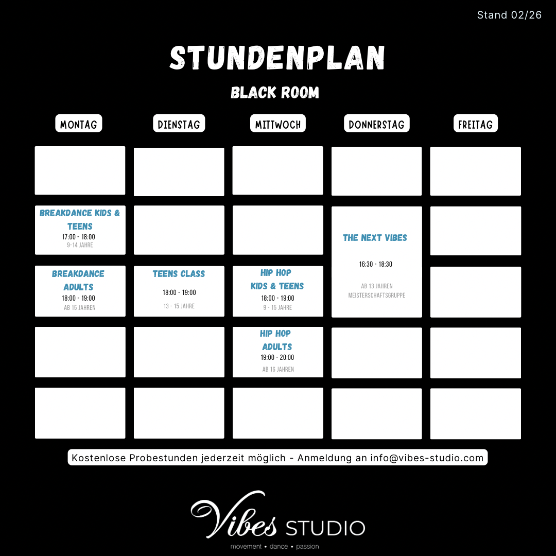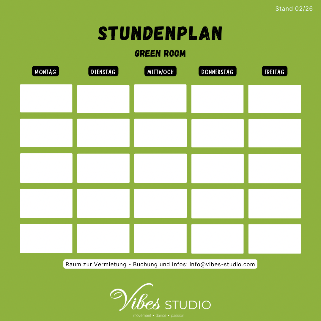 Hier findest du die Stundenpläne für beide Räume im Vibes Studio. Wenn du dich für bestimmte Kurse interessierst, kannst du auch direkt über unsere Kursübersicht alle Informationen finden, oder sogar direkt über den Button eine kostenlose Probestunde vereinbaren.